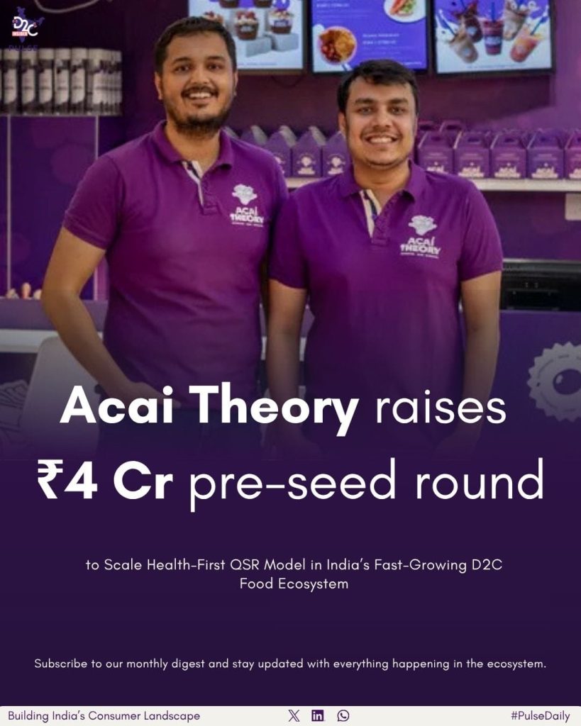 Health-focused QSR brand Acai Theory has raised ₹4 crore in a pre-seed funding round led by All In Capital, with participation from TDV Partners and a strong set of angel investors, signaling growing momentum in India’s evolving D2C ecosystem India. As part of ongoing Indian D2C updates and D2C startup news, this funding highlights increasing investor confidence in health-led food brands that blend convenience with nutrition.
