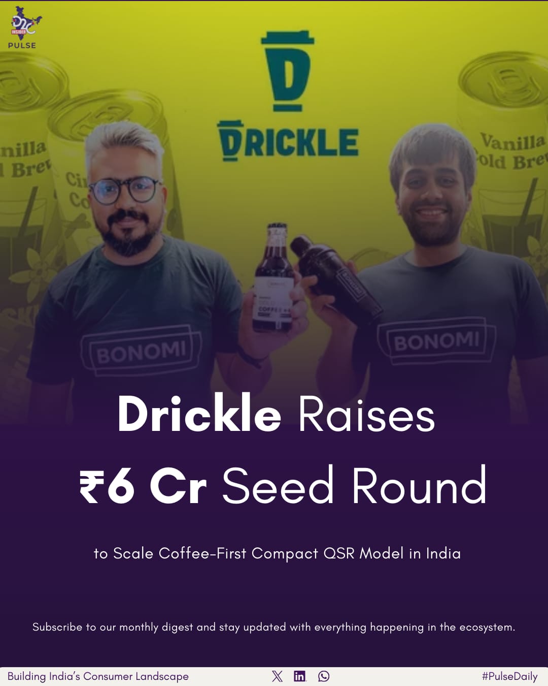 Rahul Nijhawann and Vardhman Jain started Drickle, and they have seven small shops in Bangalore, each about 150–200 square feet. They put these shops close together to get people coming back often, serving them quickly, and selling a lot. Their drinks cost between ₹100–150, and they’re trying to reach young people in cities who want cheap drinks every day.