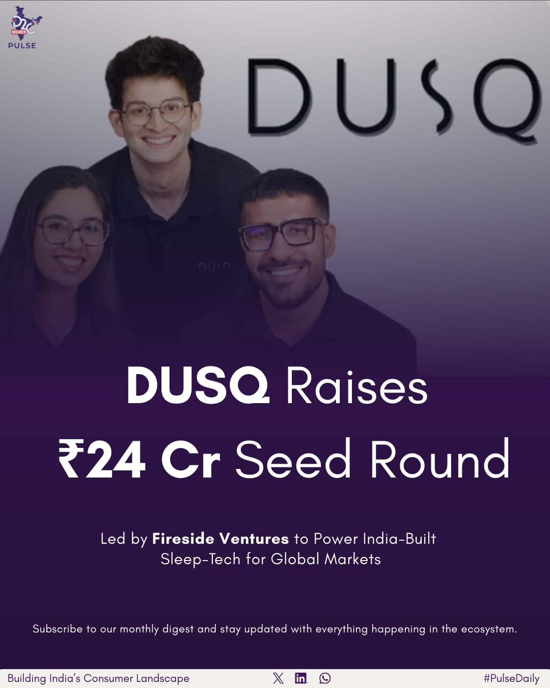 In one of the most notable announcements in today’s D2C news India, sleep science and recovery startup DUSQ has raised ₹24 crore in a seed funding round led by Fireside Ventures, marking a significant moment for Direct-to-consumer India and the broader D2C ecosystem India. The round also saw participation from Antler India, Climber Capital, Startup Sherpas, Vaishav Investments, Avnish Anand (Founder, CaratLane), and Shivam Puri — positioning DUSQ among the VC-backed D2C brands shaping the future of India’s health-tech innovation.