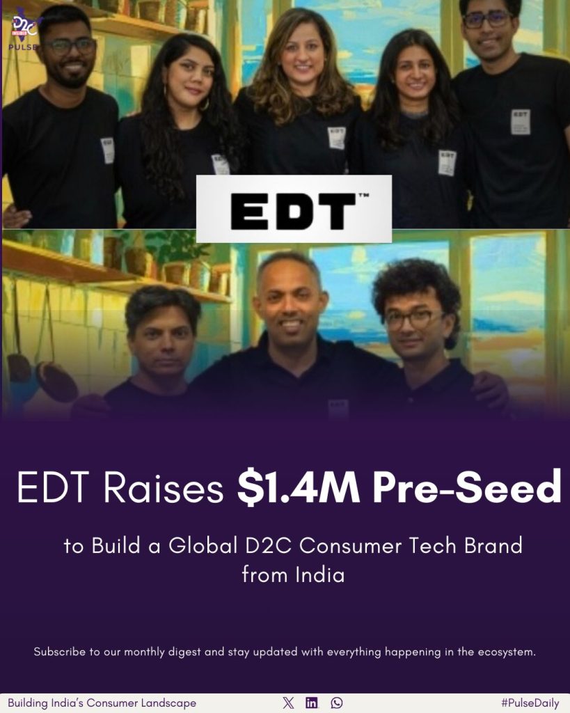 India’s D2C ecosystem continues to see strong early-stage momentum as EDT (Everyday Design & Technology) announced its $1.4 million pre-seed funding round, officially emerging from stealth. The round was led by Sauce.vc, with early backing from Consumer Collective by Atrium and Spark by Peak XV Partners, along with a wide group of marquee angel investors, founders, and global operators. The development adds to the latest D2C news India and highlights rising investor confidence in India-led consumer technology brands.