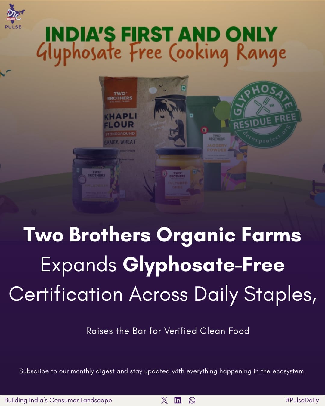 Two Brothers Organic Farms is making waves in India’s clean food scene. They’ve gotten their Khapli Atta, Amlaprash, and Jaggery certified as Glyphosate Residue-Free, just like their A2 Cultured Ghee did before. It caused quite the stir among D2C watchers in India.